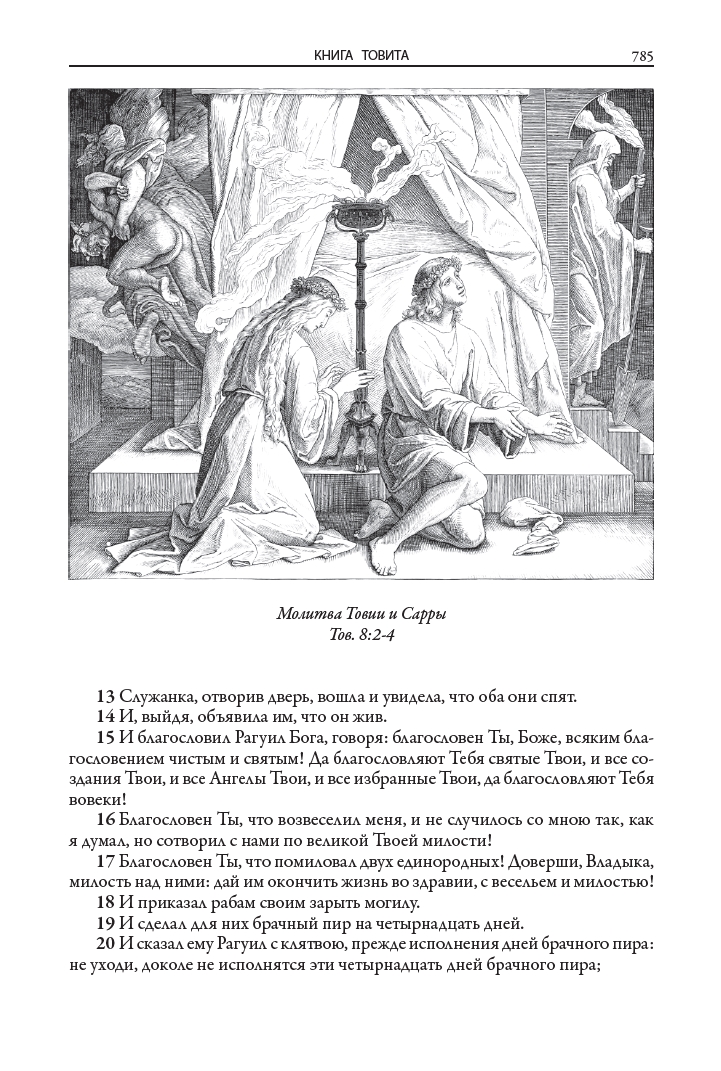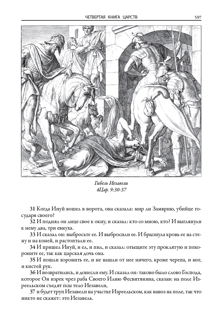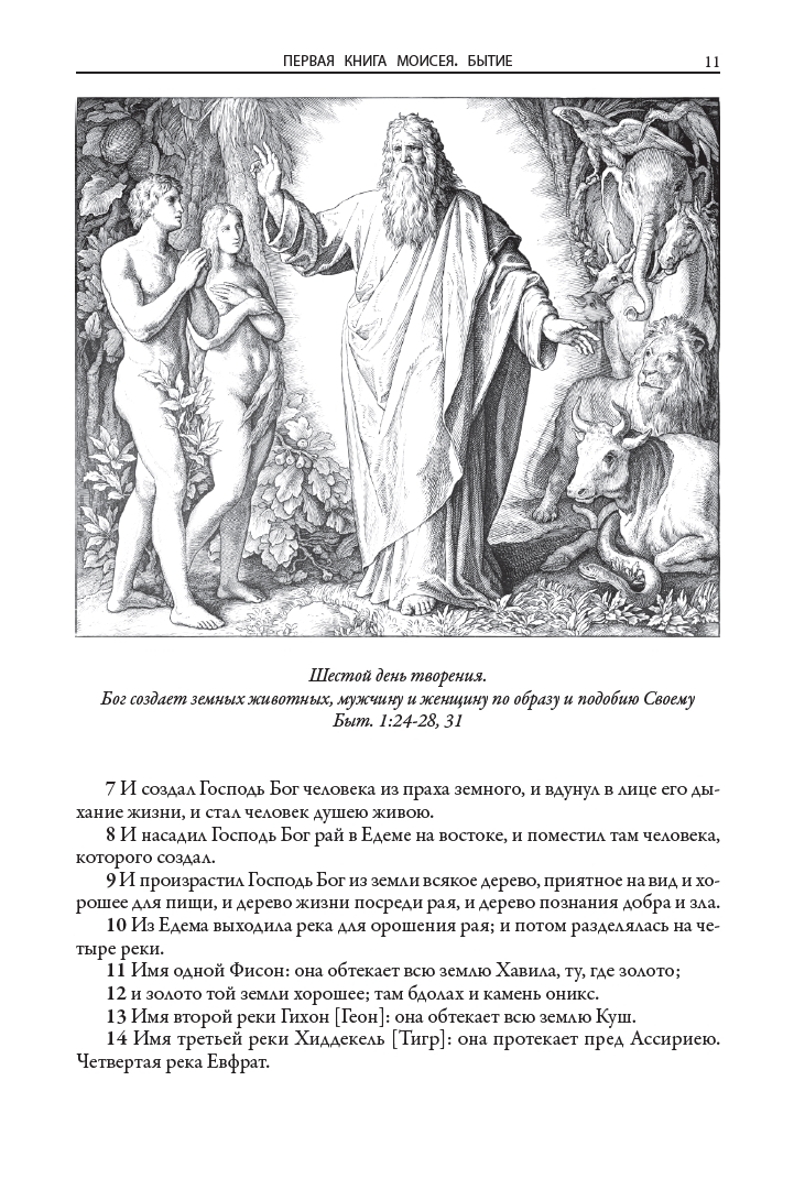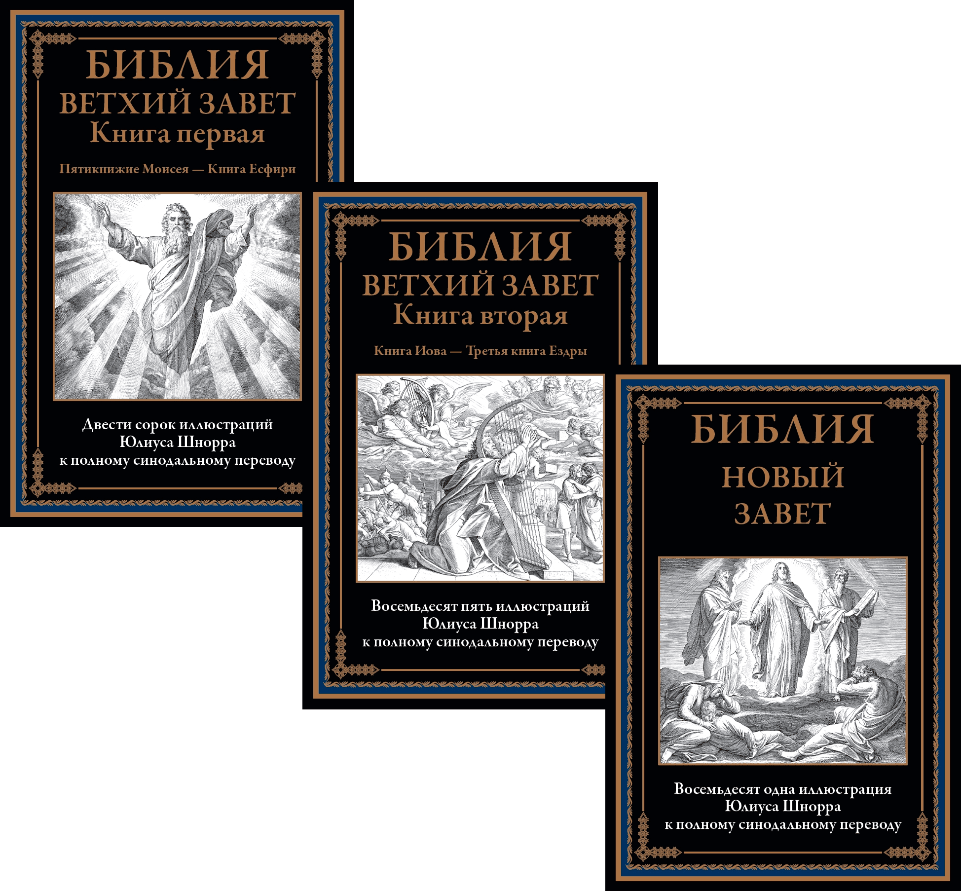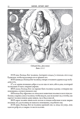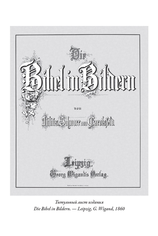 Иллюстрации к книгам (160 к Ветхому завету и 80 к Новому завету) выполнил немецкий живописец, рисовальщик и гравер академического направления, профессор дрезденской Академии искусств и директор Картинной галереи в Дрездене Юлиус Фейт Ханс Шнорр фон Карольсфельд (1794–1872). Еще в марте 1817 года он стал членом Союза святого Луки, или общества назарейцев — творческого объединения немецких и австрийских художников романтического направления начала XIX века, стремившихся возродить эстетику и художественный стиль мастеров Средневековья и раннего итальянского Возрождения. С 1824 года Шнорр вынашивал идею создания цикла иллюстраций для Библии, и наконец в 1860 году его планы были реализованы: в лейпцигском издательстве Георга Виганда вышла «Библия в картинках» — книга, со временем переведенная на множество языков и многократно переиздававшаяся в разных странах мира.