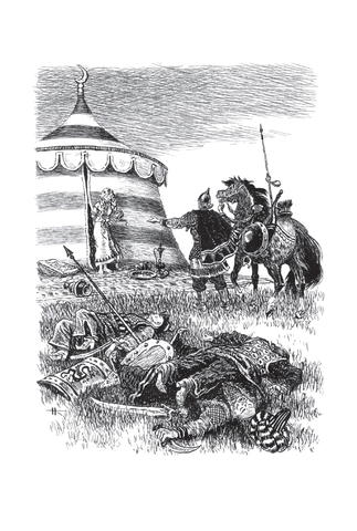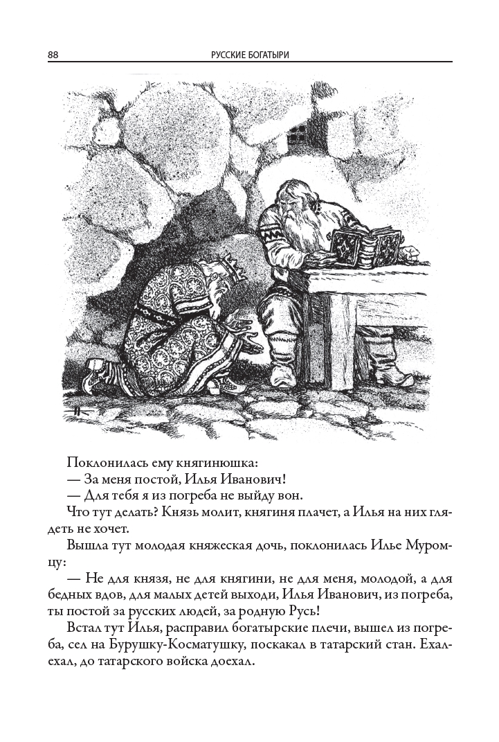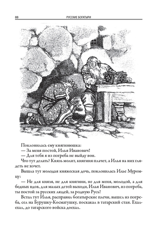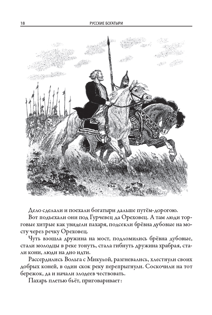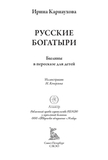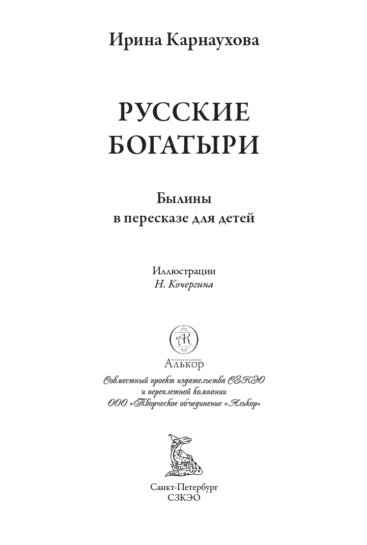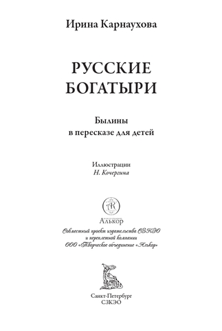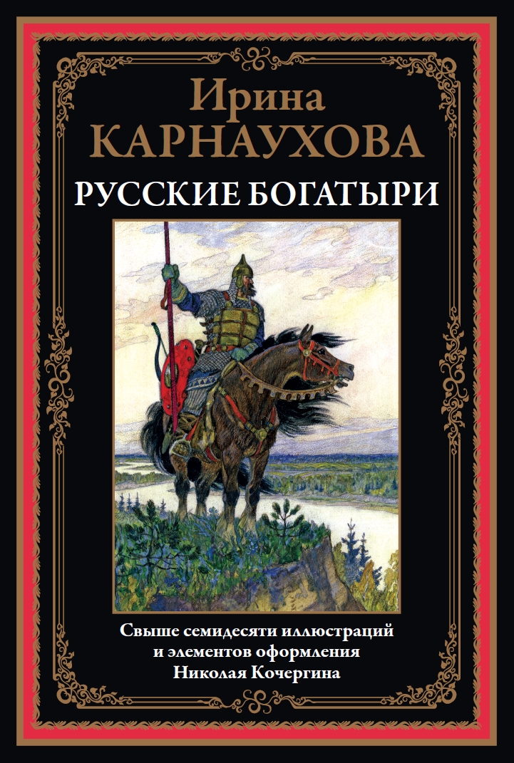 Ирина Валериановна Карнаухова (1901–1959) — советская детская писательница, собирательница и исполнительница народных сказок. Ирина родилась в Киеве в семье железнодорожного служащего и сотрудницы одной из киевских газет. С ранних лет она много читала и хорошо училась. В разгар Гражданской войны девушка окончила Киевскую гимназию. Позднее, в 1922 году, Ирина переехала в Петроград и поступила на Высшие государственные курсы искусствоведения при Российском институте истории искусств. Там она погрузилась в литературную среду и снискала славу исполнительницы русских народных сказок. По окончании учебы девушка осталась в институте: она начала работать в Секции изучения крестьянского искусства. Писательница принимала участие в нескольких фольклорных экспедициях в Заонежье и Пинегу, а следом — на реки Мезень и Печору. Ирина Валериановна собирала старинные русские сказки, которые затем литературно обрабатывала и публиковала. Результатом ее трудов стали статьи о крестьянских сказках и суевериях, публиковавшиеся в научных сборниках, а также различные литературные произведения. Всерьез заниматься литературным творчеством Ирина Валериановна начала, когда институт был реорганизован и она лишилась работы. Особенно ей нравилось писать для детей. Она пересказывала народные предания таким образом, чтобы они были интересны и понятны юным читателям. В 1949 году впервые вышла в свет ее книга «Русские богатыри»: в ней были собраны самобытные русские былины о подвигах витязей русского эпоса. Книга полюбилась советским читателям и не раз переиздавалась. В данном издании, как и в сборнике 1949 года, русские былины Ирины Карнауховой приводятся с иллюстрациями Николая Кочергина.