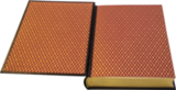 Обработка блока с трех сторон, методом механического торшенирования, с нанесением золотой матовой полиграфической фольги горячим тиснением.