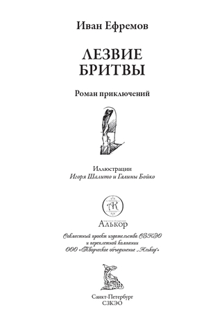 В данном издании читатели могут познакомиться с легендарным приключенческим романом Ивана Ефремова «Лезвие бритвы». Над этим произведением писатель усердно работал на протяжении нескольких лет; в 1963 году роман был опубликован в журнале «Нева». Теперь «Лезвие бритвы» считается одним из самых значимых сочинений Ефремова. Автор освещает необходимость познания психологической сущности человека в условиях стремительного развития науки, поднимает социально-философские вопросы и изображает мир, где человек проявляет свои лучшие качества, трудясь во имя общего блага.