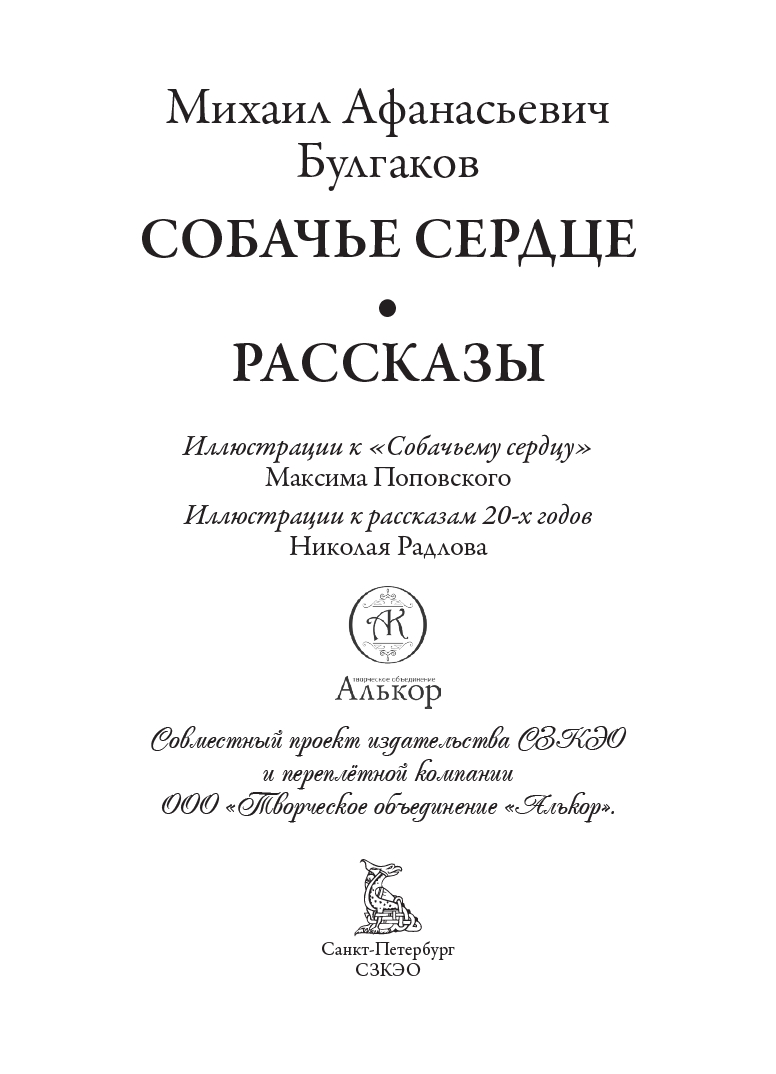 Помимо знаменитой повести «Собачье сердце» Михаила Афанасьевича Булгакова, которая печатается по последней выправленной автором машинописи, в книгу включены двенадцать рассказов писателя, в том числе из цикла «Золотые корреспонденции Ферапонта Ферапонтовича Капорцева» и «Самоцветный быт». Повесть проиллюстрирована динамичными рисунками талантливого современного художника Максима Поповского, рассказы — рисунками, выполненными Николаем Эрнестовичем Радловым (1889–1942).