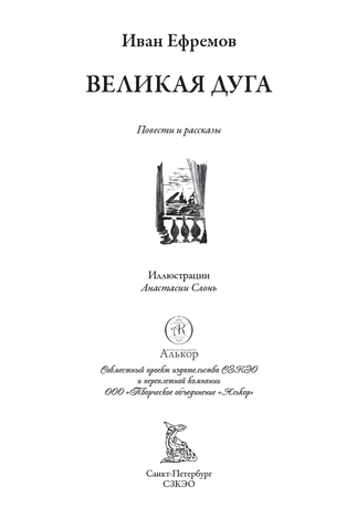 В данное издание вошли историческая дилогия Ефремова «Великая Дуга» и одиннадцать его рассказов. «Великая Дуга» состоит из двух повестей: «Путешествие Баурджеда» и «На краю Ойкумены». Героев произведений разделяют сотни лет, но объединяют их участие в опасных путешествиях в неизведанные края, жажда свободы, чувство товарищества и тяга к прекрасному. Великая Дуга связывает воедино стремления и надежды самых разных людей, переплетая их судьбы на протяжении многих поколений. Рассказы сборника повествуют о героях — палеонтологах, геологах, моряках, летчиках, которые преодолевают себя и совершают поражающие воображение открытия. Автор простым языком объясняет невиданные природные явления, описывает сложную внутреннюю борьбу своих персонажей и обнажает их светлые человеческие чувства. Тексты издания проиллюстрированы проникновенными и выразительными рисунками современной художницы Анастасии Слонь.