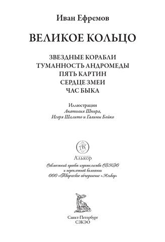 В 1937 году Ефремов получил диплом об окончании с отличием Горного института и уже в 1941 году стал доктором биологических наук. Однако помимо научных открытий была в жизни Ефремова еще одна страсть — литература. Его писательское наследие богато и разнообразно, в него входят романы, рассказы и повести. Ефремов не только умел придумывать фантастические сюжеты, для его литературного стиля характерна научная точность деталей, проработанность персонажей и неискоренимая вера в светлое будущее, в возможность создать более совершенное общество. В данное издание вошли следующие произведения писателя: повесть «Звездные корабли», роман «Туманность Андромеды», рассказ «Пять картин», повесть «Сердце Змеи» и роман «Час Быка». Фантастическая повесть «Звездные корабли» рассказывает о поисках археологами следов «звездных пришельцев», посетивших нашу планету в эпоху динозавров. Действие романа «Туманность Андромеды», который был опубликован в год запуска первого искусственного спутника Земли, перенесено писателем на тысячи лет вперед. Роман рассказывает о повседневной жизни, устремлениях и мечтах наших далеких потомков — повелителей Космоса. Именно благодаря данному роману Иван Ефремов получил мировую известность как писатель-фантаст. Рассказ «Пять картин» повествует о группе товарищей, с любопытством рассматривающих бесценные образцы искусства древности. В повести «Сердце Змеи» описывается взаимодействие людей с инопланетной цивилизацией. В романе «Час Быка» жители коммунистической Земли из далекого будущего отправляются в путешествие на планету Торманс, где обнаруживают людей, построивших закрытое тоталитарное общество.