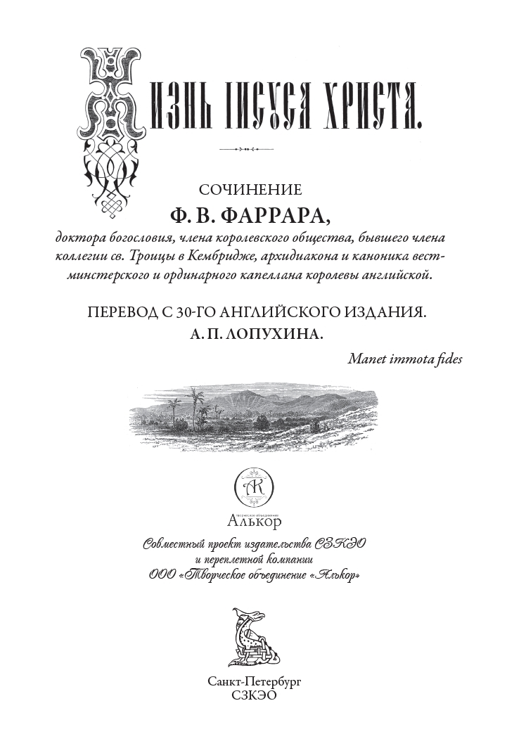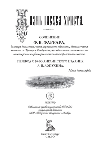 «Жизнь Иисуса Христа» — наиболее популярное в России сочинение Фаррара. В дореволюционный период оно выдержало множество переизданий; печатается эта книга и в наши дни. Ее текст был впервые опубликован в 1874 году. Сюжет повествует о земной жизни Иисуса. Фаррар излагает события Писания в хронологическом порядке и подвергает их историческому анализу. Перевод текста на русский язык был выполнен Александром Павловичем Лопухиным (1851–1904) — русским церковным писателем, исследователем и богословом, занимавшимся просветительской работой и толкованием Священного Писания. Издание украшают карты, иллюстрации, буквицы и другие оформительские элементы, выполненные несколькими художниками.